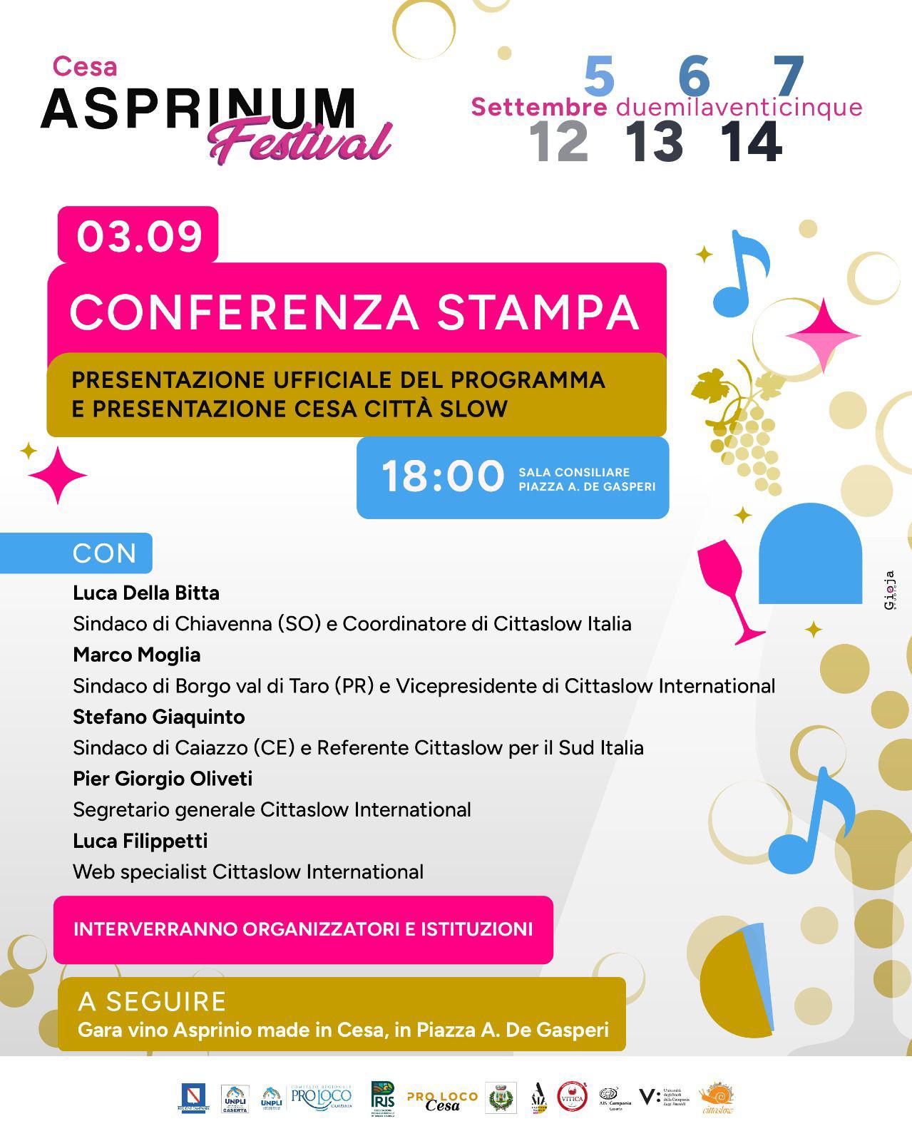 L’appuntamento di apertura sarà la presentazione di “Cesa Città Slow”, mercoledì 3 settembre alle ore 18 presso la sala consiliare in piazza De Gasperi, metterà in luce l’impegno verso uno sviluppo sostenibile, attento alla qualità della vita e alla promozione delle eccellenze locali. Il vino Asprinio sarà protagonista sin da subito con una gara dedicata ai migliori produttori locali, che premierà la qualità e l’innovazione nel rispetto della tradizione che si svolgerà in piazza De Gasperi dalle ore 19.