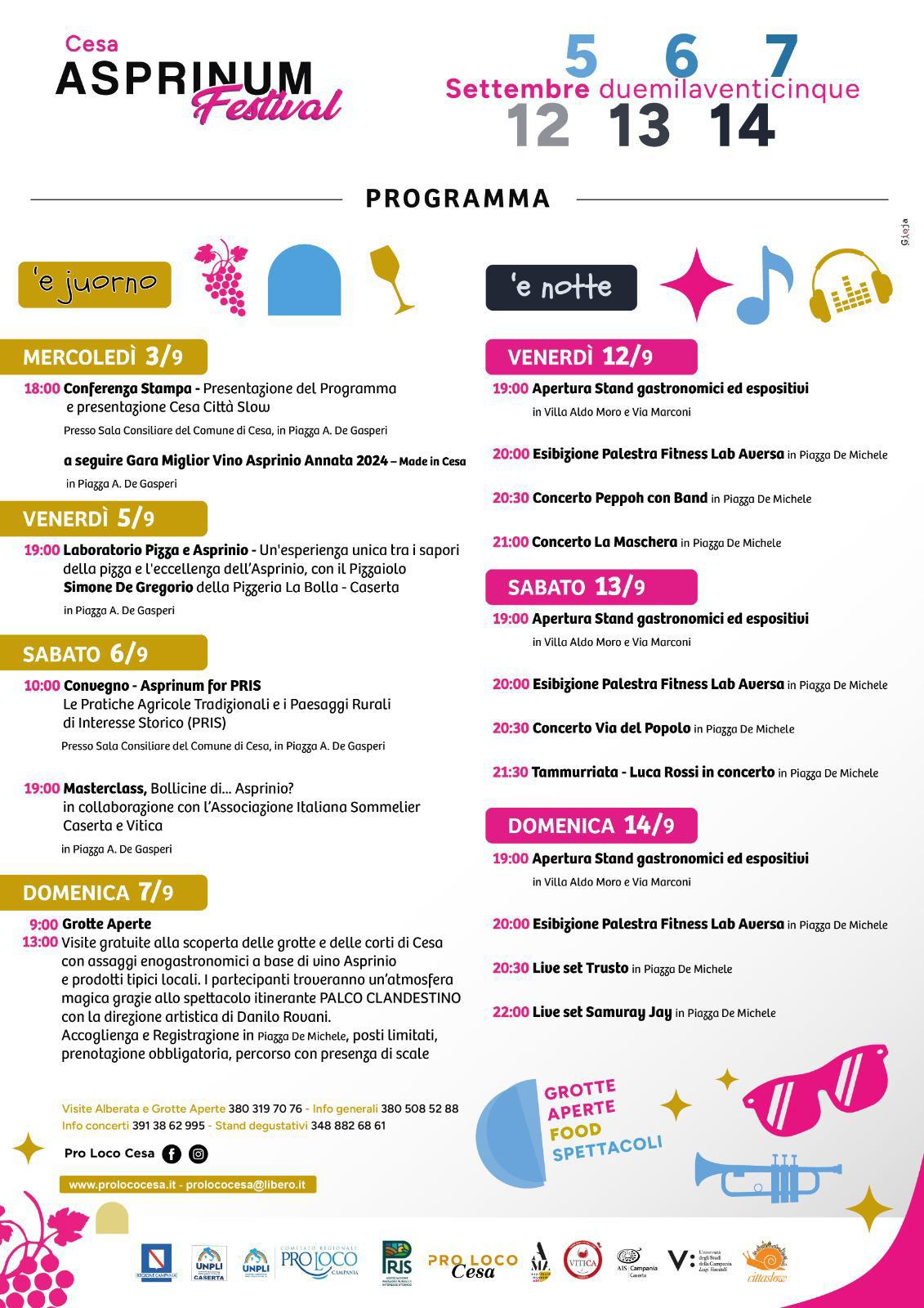 Cesa si prepara a ospitare l’edizione 2025 dell’Asprinum Festival, la manifestazione, organizzata dalla Pro Loco in collaborazione con il Comune di Cesa, che ogni anno celebra il vino Asprinio e il paesaggio rurale che lo caratterizza, tra le celebri alberate aversane, le grotte tufacee e il ricco patrimonio culturale della cittadina. L’evento si articola in due momenti distinti, intitolati “E Juorn” e “E Nott”, che animeranno il mese di settembre con un programma ricco di appuntamenti.