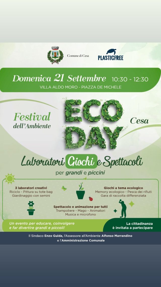 Cesa(CE). Cesa si prepara ad accogliere il Festival dell’Ambiente – Eco Day, in programma domenica 21 settembre dalle 10:30 alle 12:30 presso Villa Aldo Moro, in Piazza De Michele. L’iniziativa, promossa dall’Assessorato all’Ambiente del Comune, retto da Alfonso Marrandino, in collaborazione con l’associazione Plastic Free, sarà una mattinata all’insegna della sensibilizzazione ambientale, dell’educazione ecologica e del divertimento, con attività pensate per coinvolgere bambini, famiglie e cittadini di tutte le età.